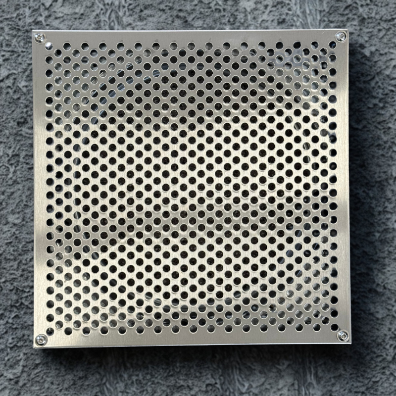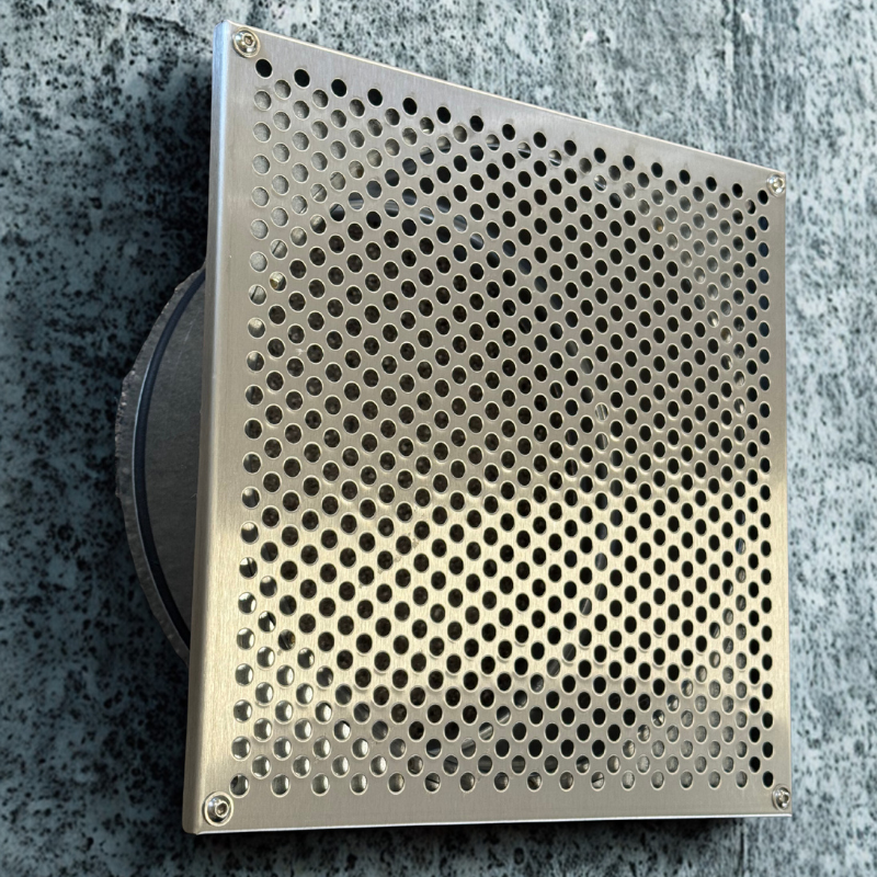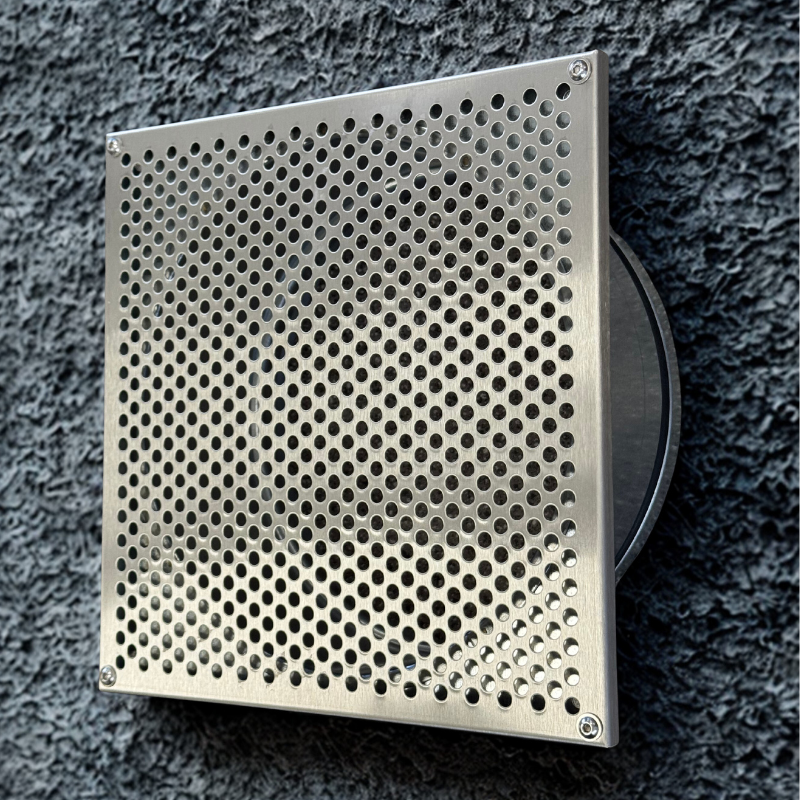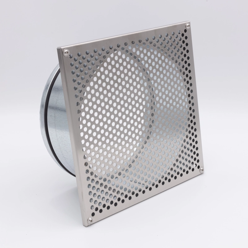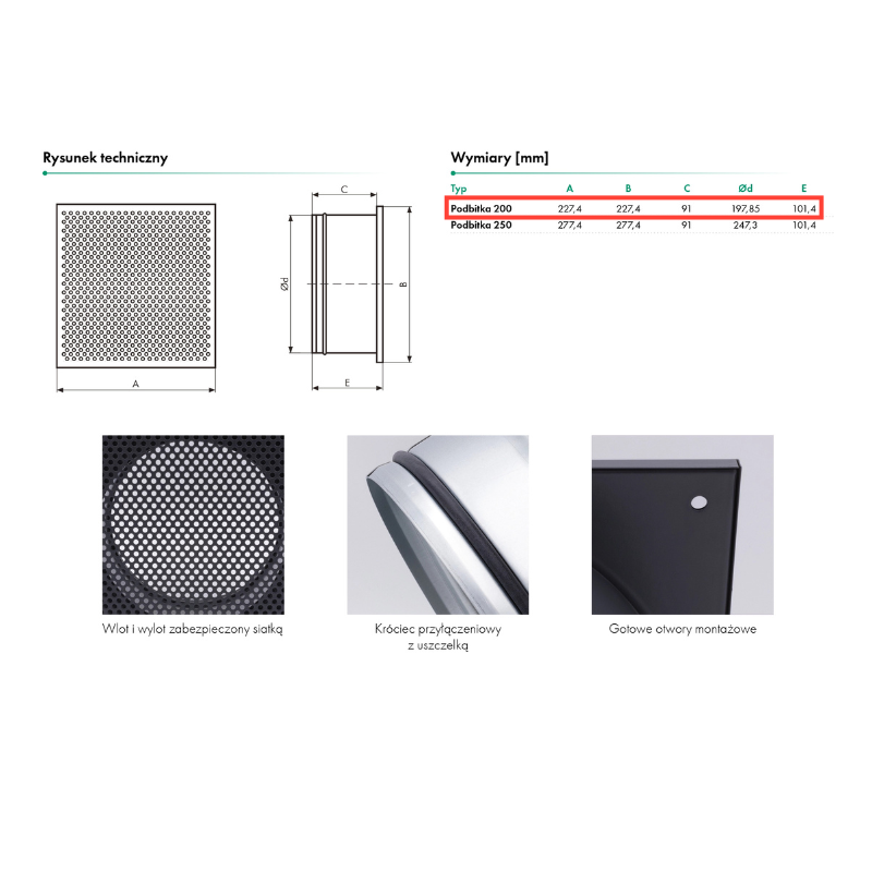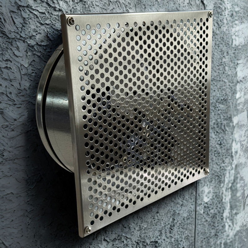 Stalowa szlifowana czerpnia do montażu w podbitce. Średnica fi 200mm, wymiar zewnętrzny 227,4 x 227,4mm.