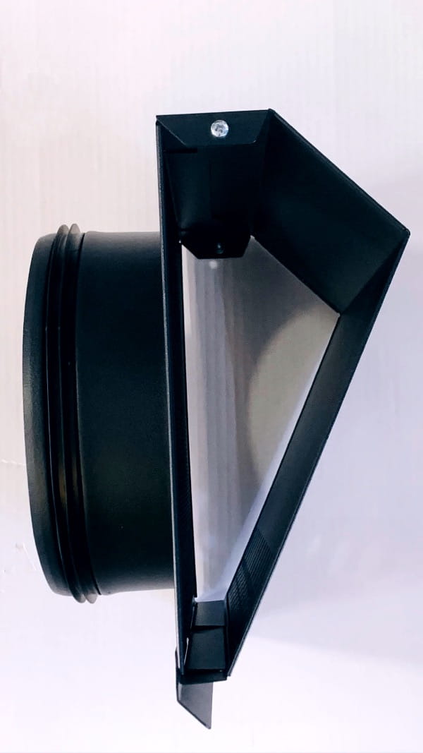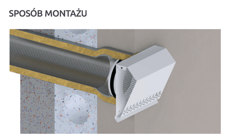 Standardowo wyposażona w okapnik chroniący ścianę przez powstawaniem zacieków oraz siatkę zabezpieczającą otwór wlotowy. Specjalnie zaprojektowana geometria zapewnia minimalny