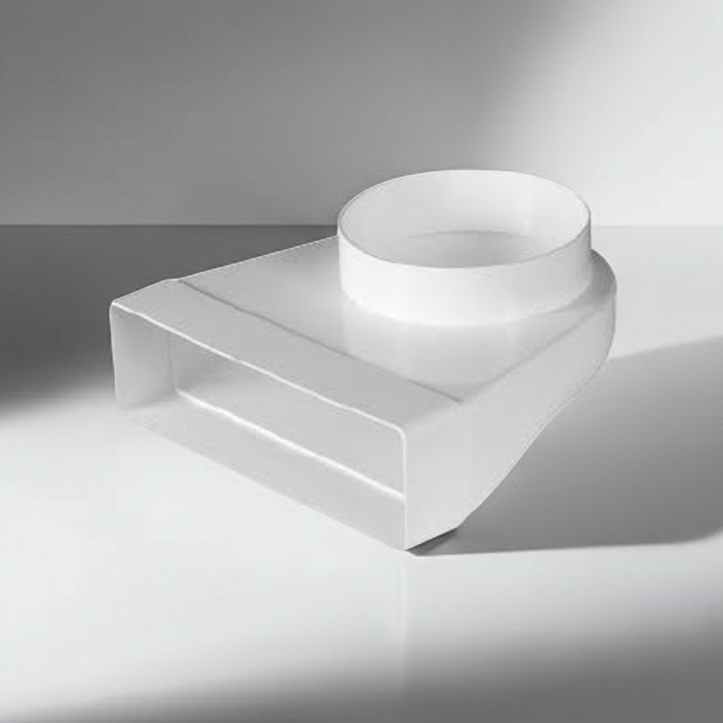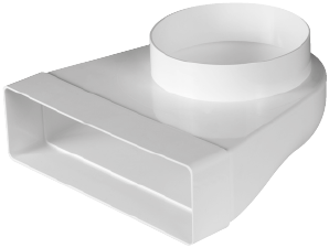Kolano łącznikowe systemu wentylacyjnego z PVC o wymiarach 204x60mm na fi 125mm. Kolano łącznikowe umożliwia zmianę przekroju z prostokąta na okrągły. System 204x60mm jest często stosowany w odprowadzeniu oparów z nad okapu do pionu wentylacyjnego. Ze względu na swoje wymiary (odpowiada przekrojowi rury 120mm) pozwala zachować skuteczną pracę okapu przy jednoczesnym estetycznym wyglądzie.