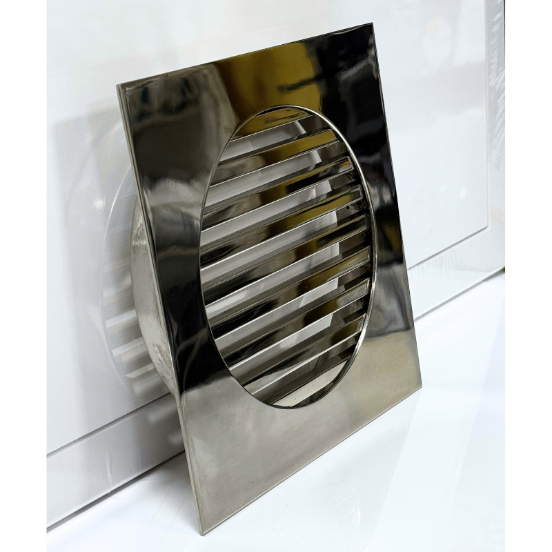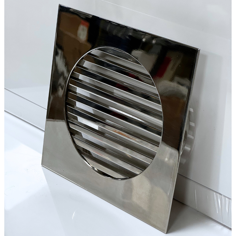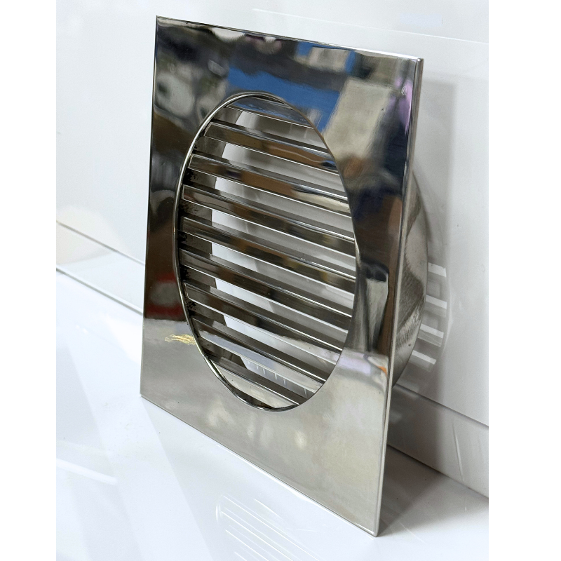 Kratka nierdzewna wentylacyjna wykonana z wysokiej jakości stali nierdzewnej polerowanej. Wymiar wpustu montażowego kratki okrągły do montażu w rurze 125mm. Wymiar zewnętrzny kratki ok. 145x145mm. Wypełnienie kratki stanowią pręty nierdzewne polerowane o wymiarze 6x6mm. Kratkę charakteryzuje elegancki design oraz fakt, że po zamontowaniu praktycznie licuje się ze ścianą. Standardowo, kratkę wkleja się do otworu w ścianie.