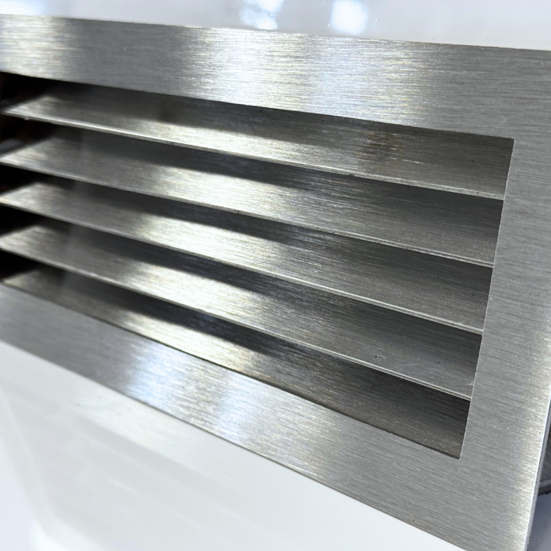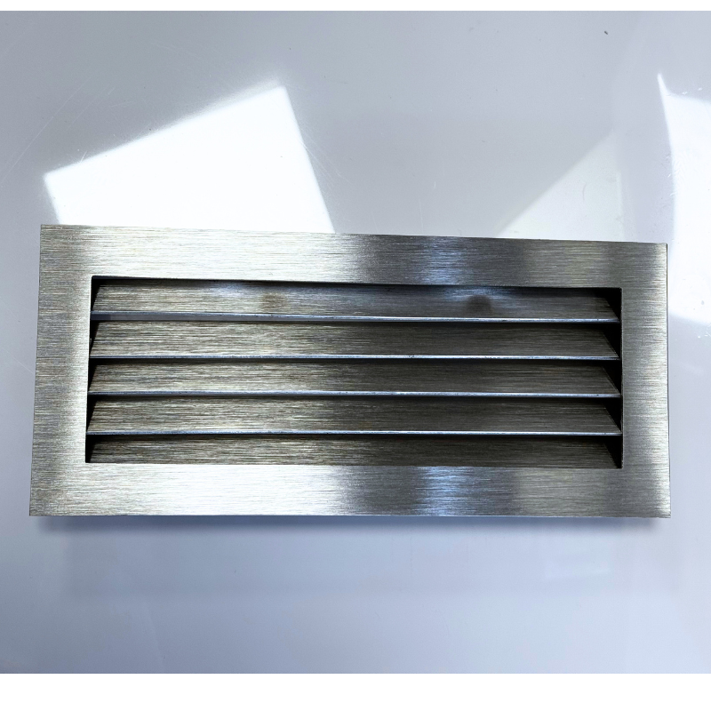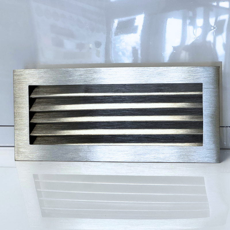 Kratka nierdzewna wentylacyjna wykonana z wysokiej jakości stali nierdzewnej szlifowanej do zakończenia kanału wentylacyjnego o wymiarach 220x90mm. Wypełnienie kratki stanowią płaskowniki nierdzewne zamontowane pod stałym kątem 45 stopni. Kratkę charakteryzuje elegancki design oraz fakt, że po zamontowaniu praktycznie licuje się ze ścianą. Standardowo, kratkę wkleja się do otworu w ścianie.