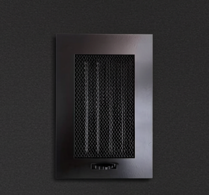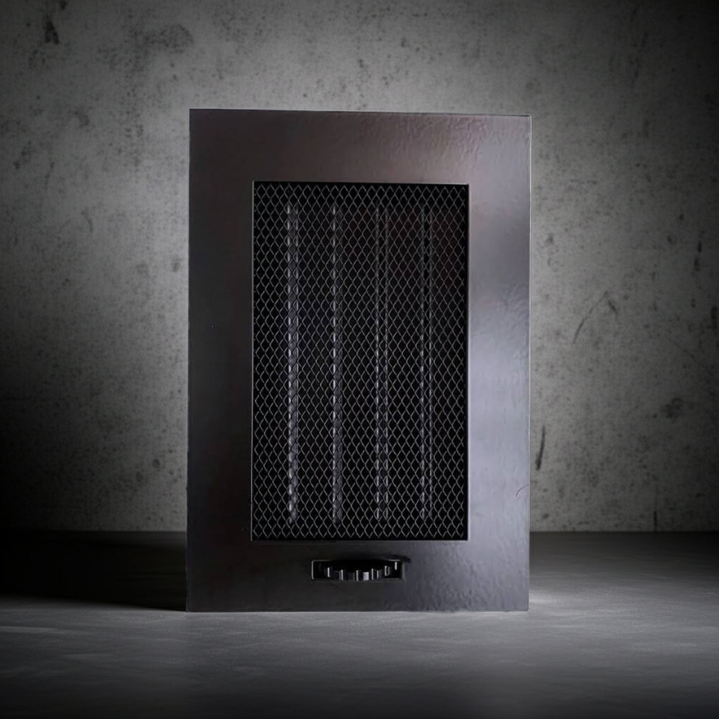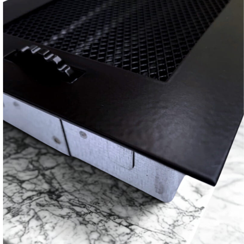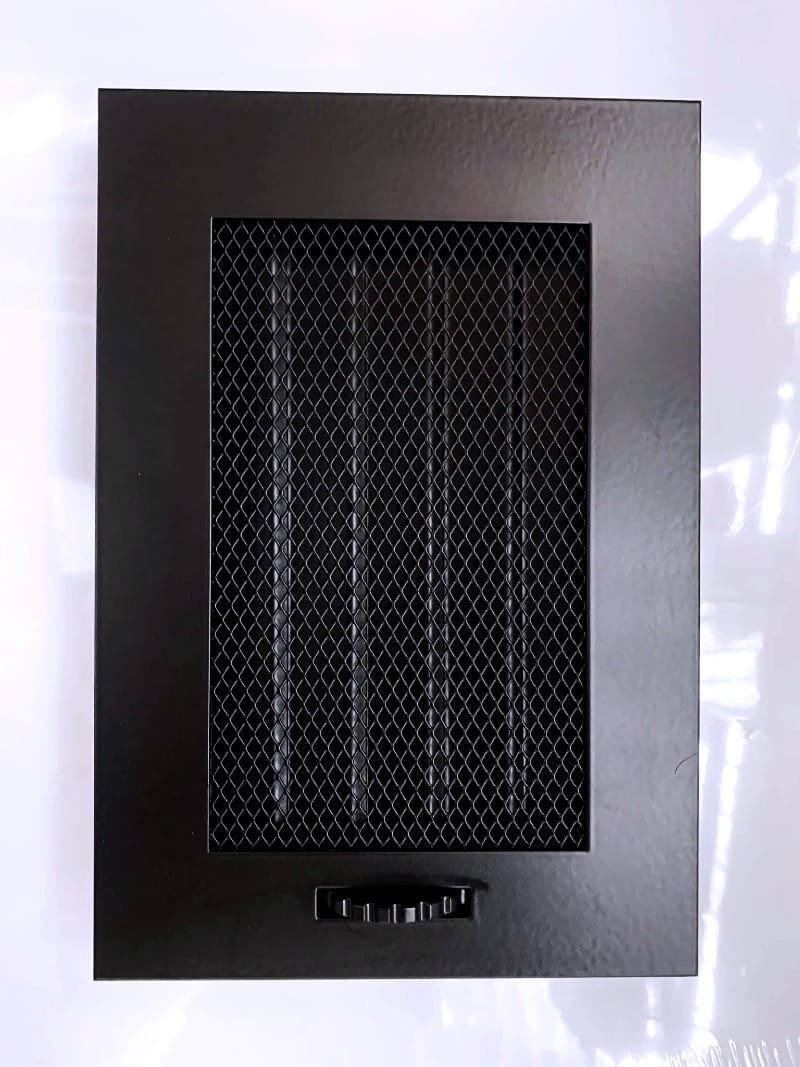 Czarna kratka kominkowa lub wentylacyjna z żaluzją. Metalowa. Wykończenie matowe.
