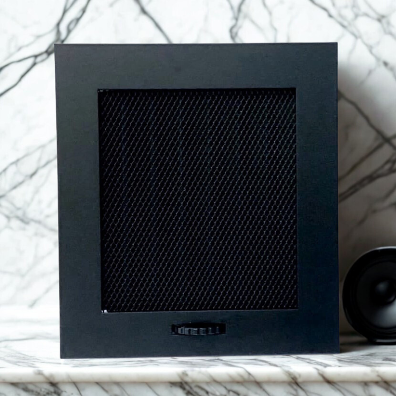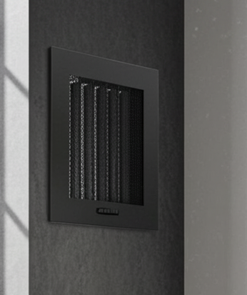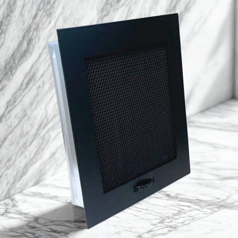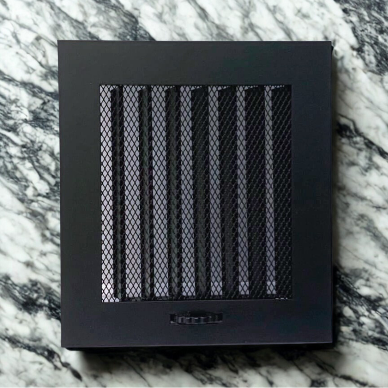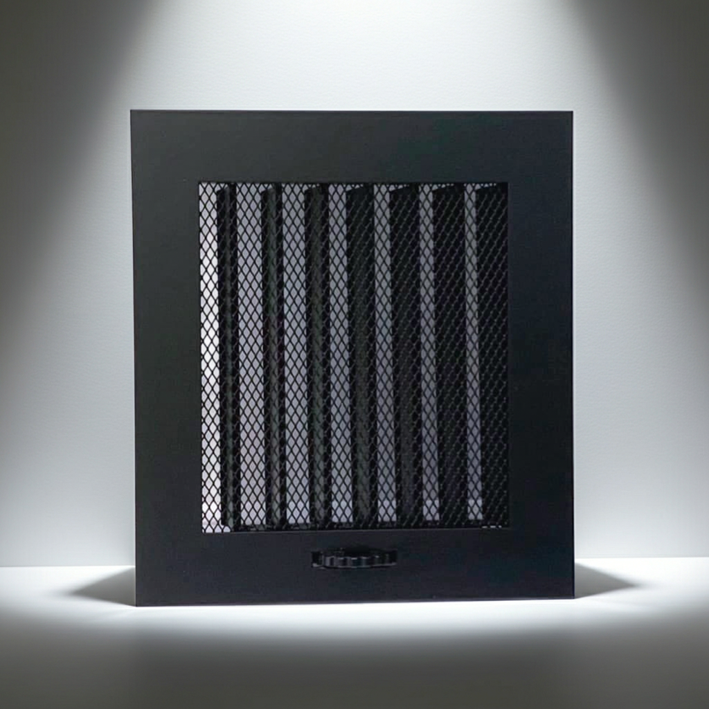 Czarna kratka kominkowa lub wentylacyjna z żaluzją. Metalowa. Wykończenie matowe.