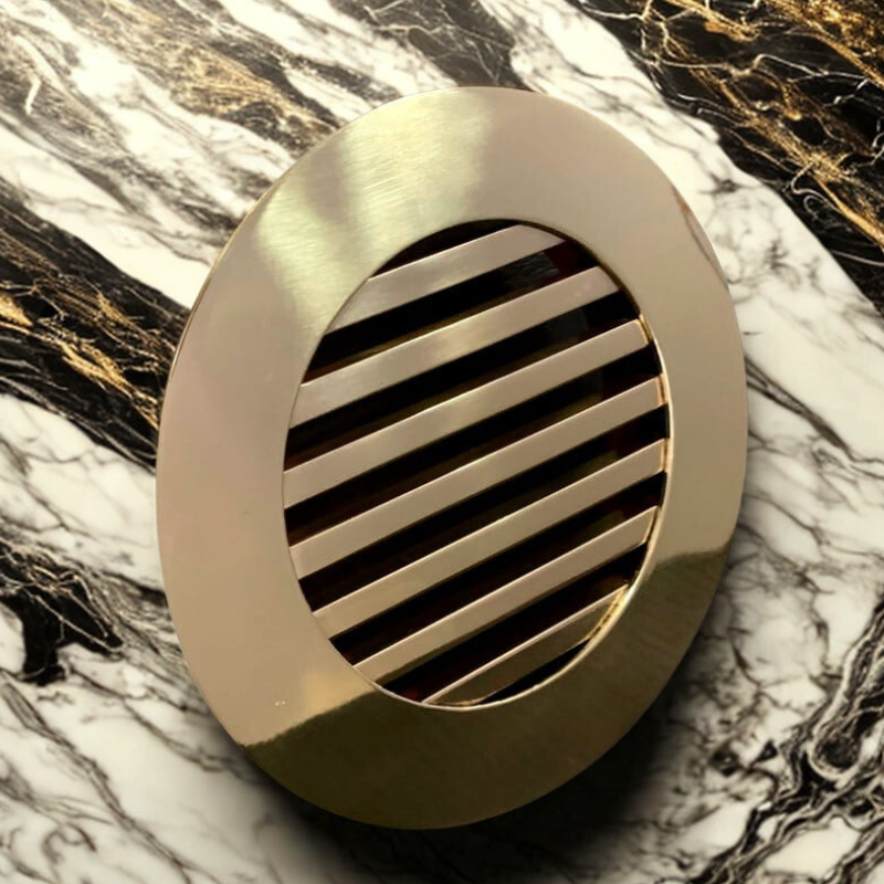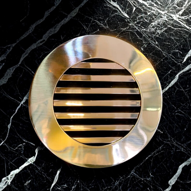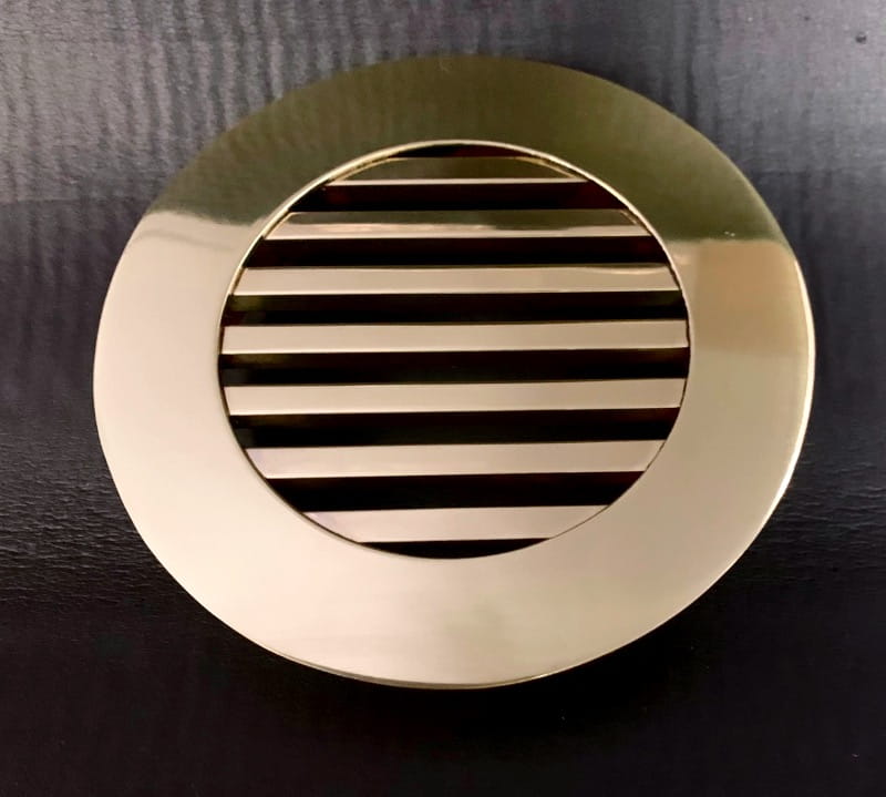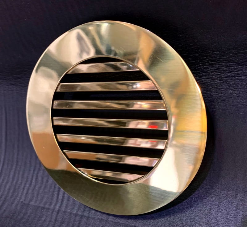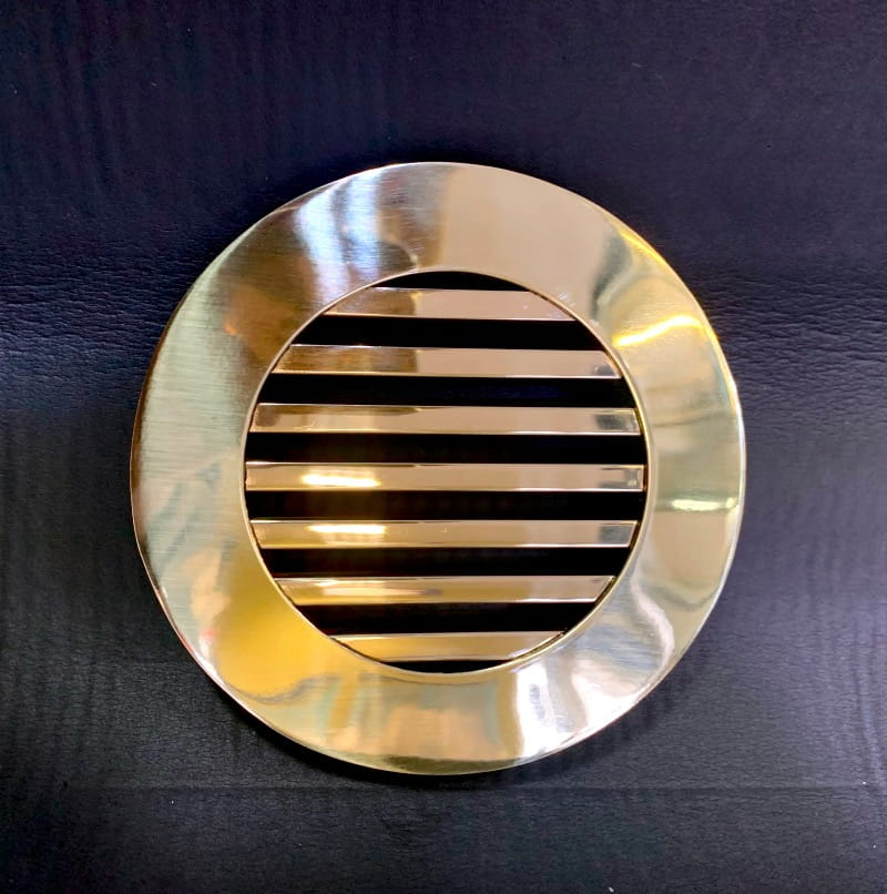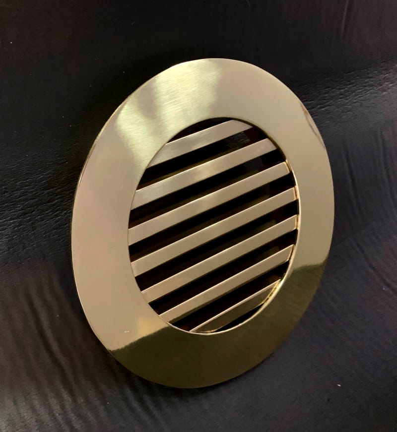 Kratka mosiężna polerowana o średnicy montażowej 100mm lub 125mm. Kratka wentylacyjna wykonana jest w całości z mosiądzu. Wypełnienie kratki stanowią pręty mosiężne o grubości 6mm. Kratkę charakteryzuje elegancji design oraz fakt, że po zamontowaniu praktycznie licują się ze ścianą. Kratki mosiężne po wykonaniu zabezpieczane są lakierem bezbarwnym.