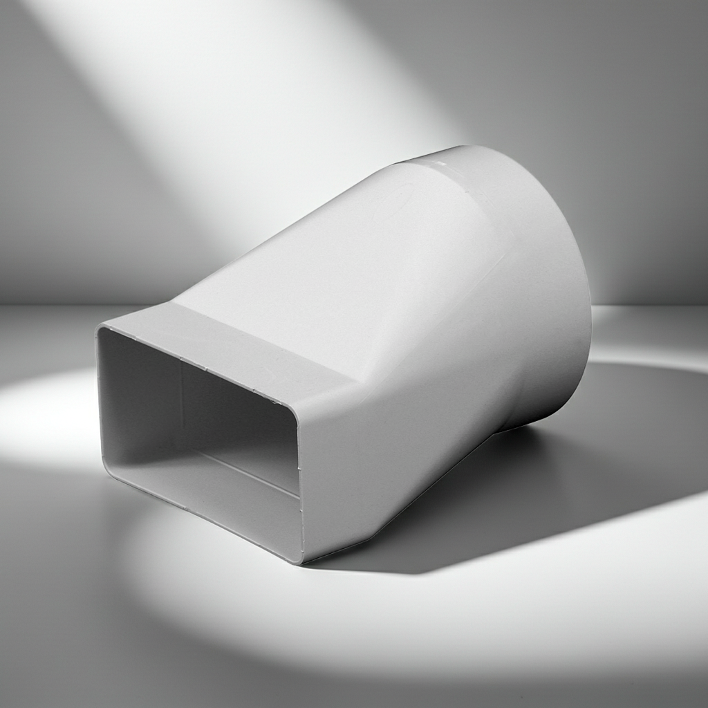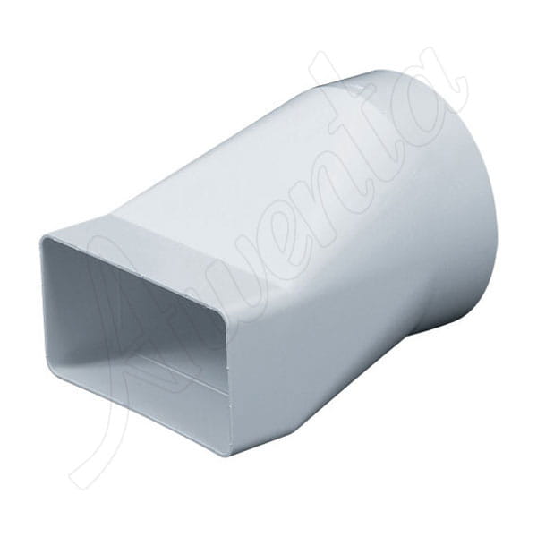 Łącznik przekrojów zmiennych systemu wentylacyjnego z PVC o wymiarach 150x75mm. Łącznik umożliwia zmianę przekroju z prostokąta na okrągły w prostej linii. Zewnętrzny wymiar okrągłej części łącznika to 128mm. System 150x75mm jest często stosowany w odprowadzeniu oparów z nad okapu do pionu wentylacyjnego. Ze względu na swoje wymiary (odpowiada przekrojowi rury 120mm) pozwala zachować skuteczną pracę okapu przy jednoczesnym estetycznym wyglądzie.