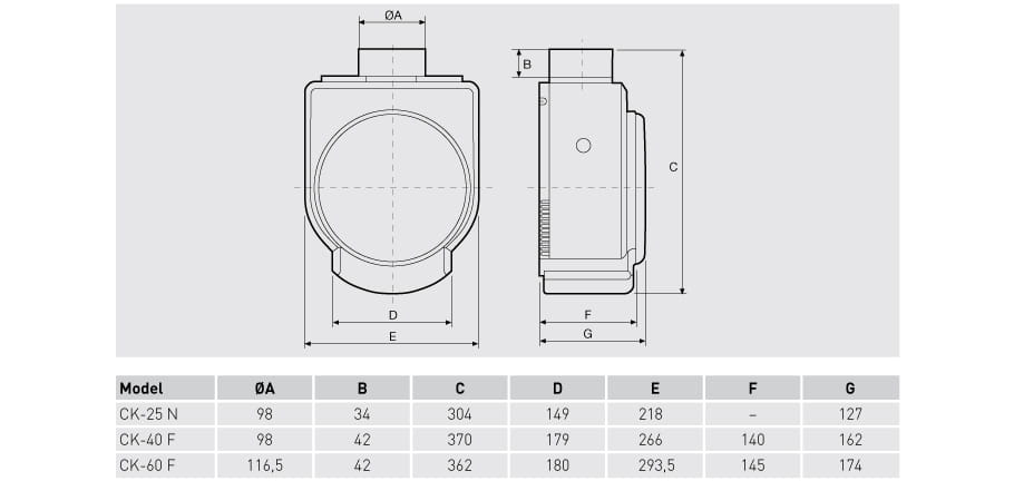 Wentylatory CK posiadają zabezpieczenie przed porażeniem prądem w klasie II, izolację uzwojenia w klasie B oraz bryzgoszczelne zabezpieczenie przed wilgocią.