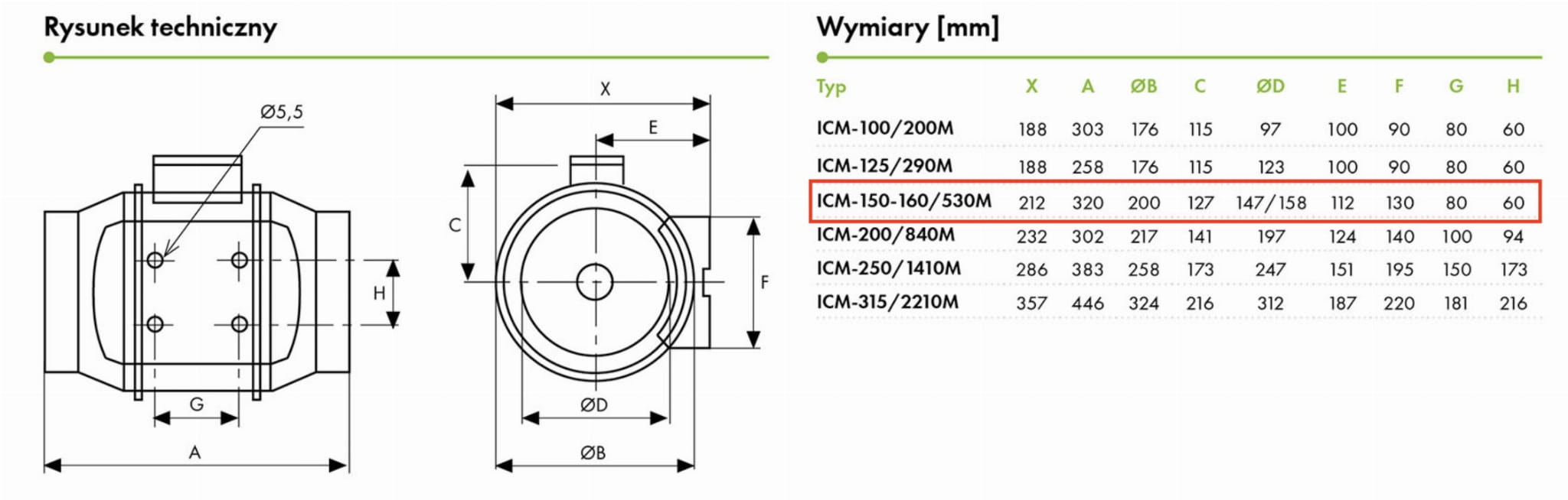 Wentylator kanałowy HAVACO ICM 150-160/530M