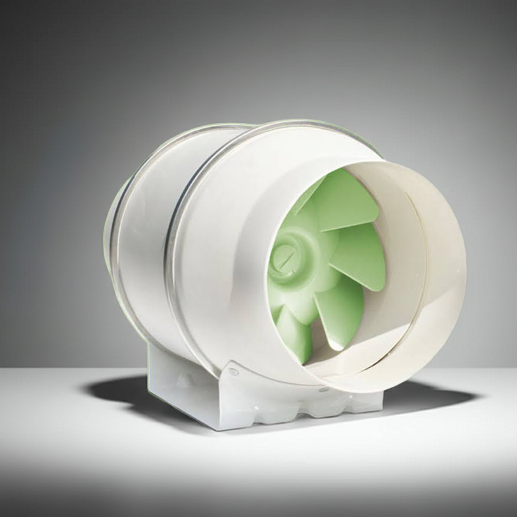 Wentylator kanałowy, diagonalny. Unikalna konstrukcja umożliwia osiągnięcie wysokich parametrów pracy przy stosunkowo niskim poziomie hałasu oraz niskim zużyciu energii. Obudowa wentylatora wykonana z polipropylenu, natomiast wirnik z tworzywa sztucznego ABS. Specjalne złącza ułatwiają montaż i demontaż urządzenia oraz jego konserwację. Urządzenie możemy instalować zarówno w pozycji poziomej, jak i pionowej.