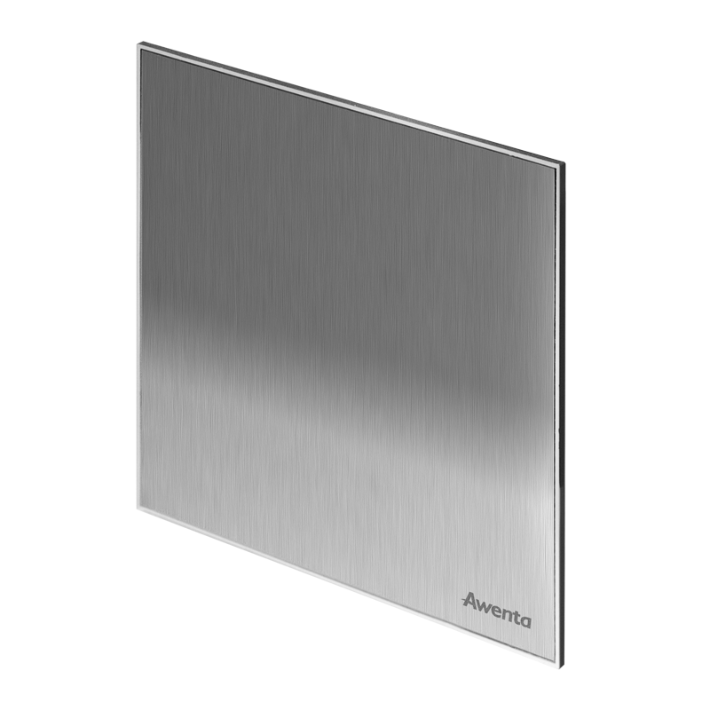 Cichy wentylator łazienkowy z nowoczesnym panelem przednim Inox. Model z timerem (opóźnieniem wyłączenia). Panel przedni wykonany z blachy inox wykończonej tworzywem. Na panelu w dolnym rogu widnieje napis Awenta. Korpus biały.