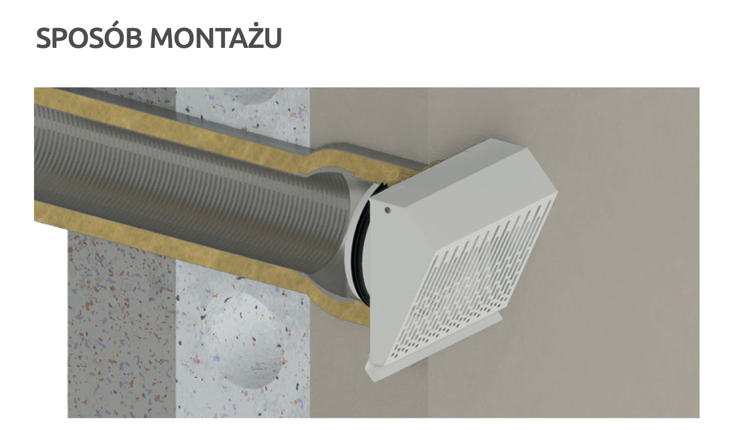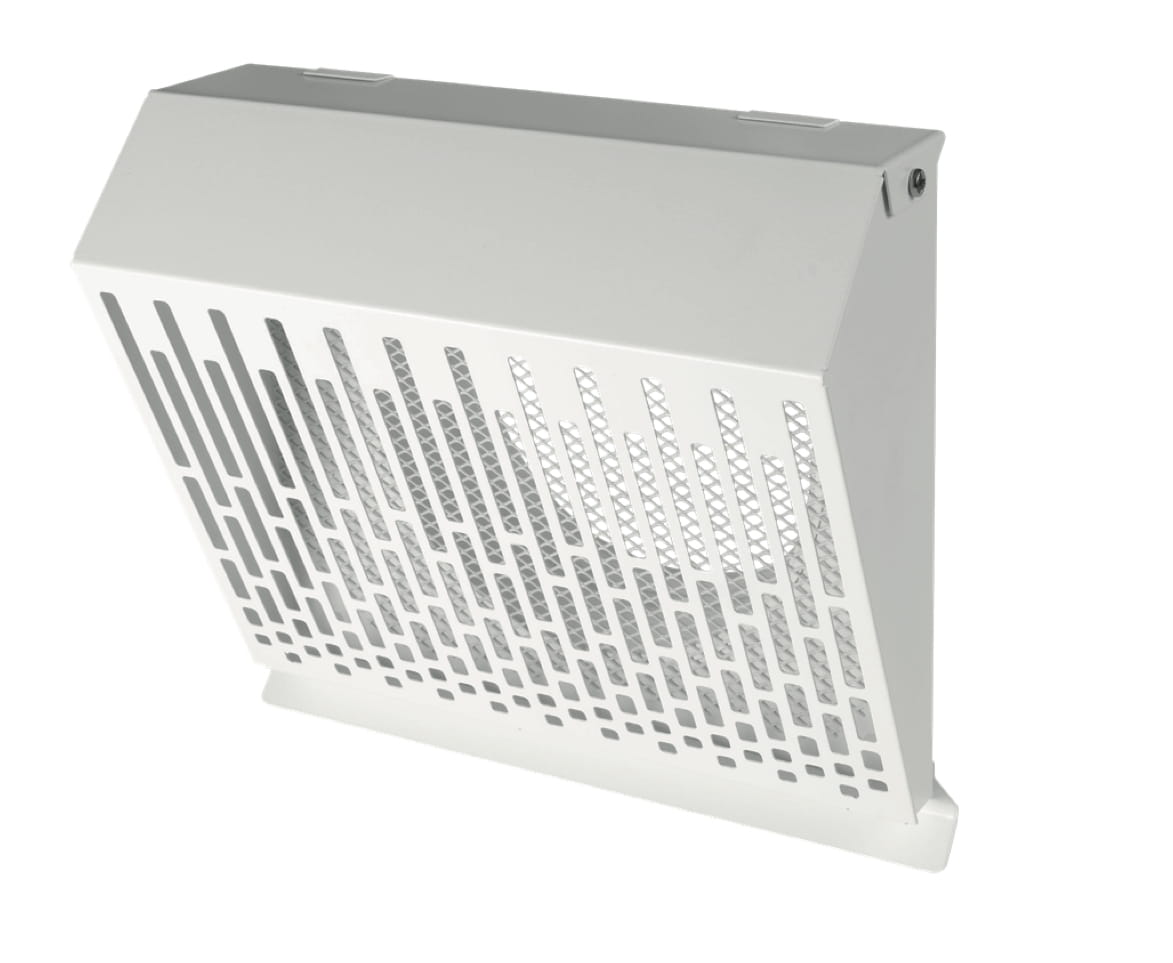 Standardowo wyposażona w okapnik chroniący ścianę przez powstawaniem zacieków oraz siatkę zabezpieczającą otwór wylotowy. Zastosowana geometria prostopadłego do ściany wyrzutu powietrza z zamknięciem bocznym zapobiega zabrudzeniu ściany od zużytego powietrza. Specjalnie zaprojektowana geometria zapewnia minimalny opór / spadek ciśnienia wyrzucanego powietrza.