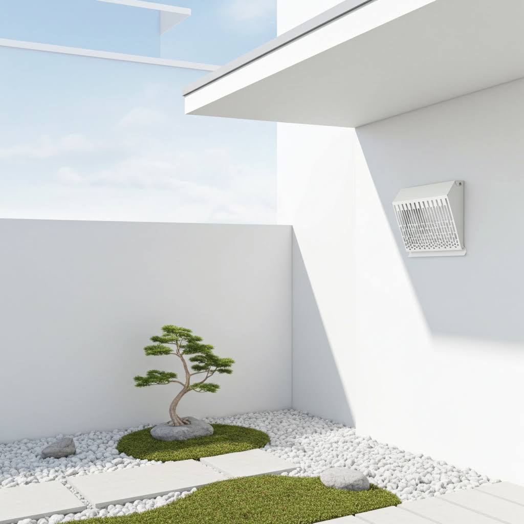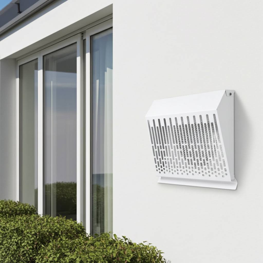 Standardowo wyposażona w okapnik chroniący ścianę przez powstawaniem zacieków oraz siatkę zabezpieczającą otwór wylotowy. Zastosowana geometria prostopadłego do ściany wyrzutu powietrza
