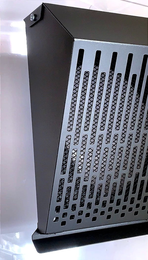 Standardowo wyposażona w okapnik chroniący ścianę przed powstawaniem zacieków oraz siatkę zabezpieczającą otwór wylotowy. Zastosowana geometria prostopadłego do ściany wyrzutu powietrza