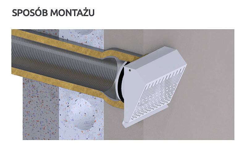 Standardowo wyposażona w okapnik chroniący ścianę przed powstawaniem zacieków oraz siatkę zabezpieczającą otwór wylotowy. Zastosowana geometria prostopadłego do ściany wyrzutu powietrza