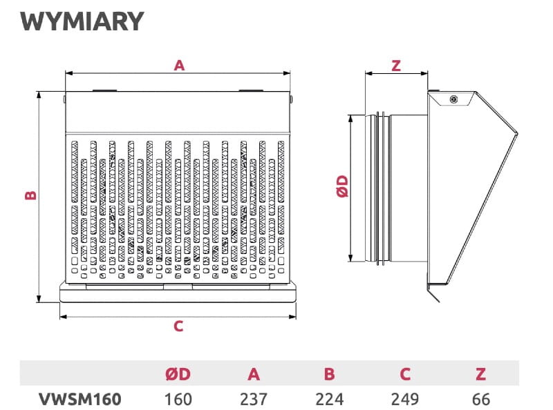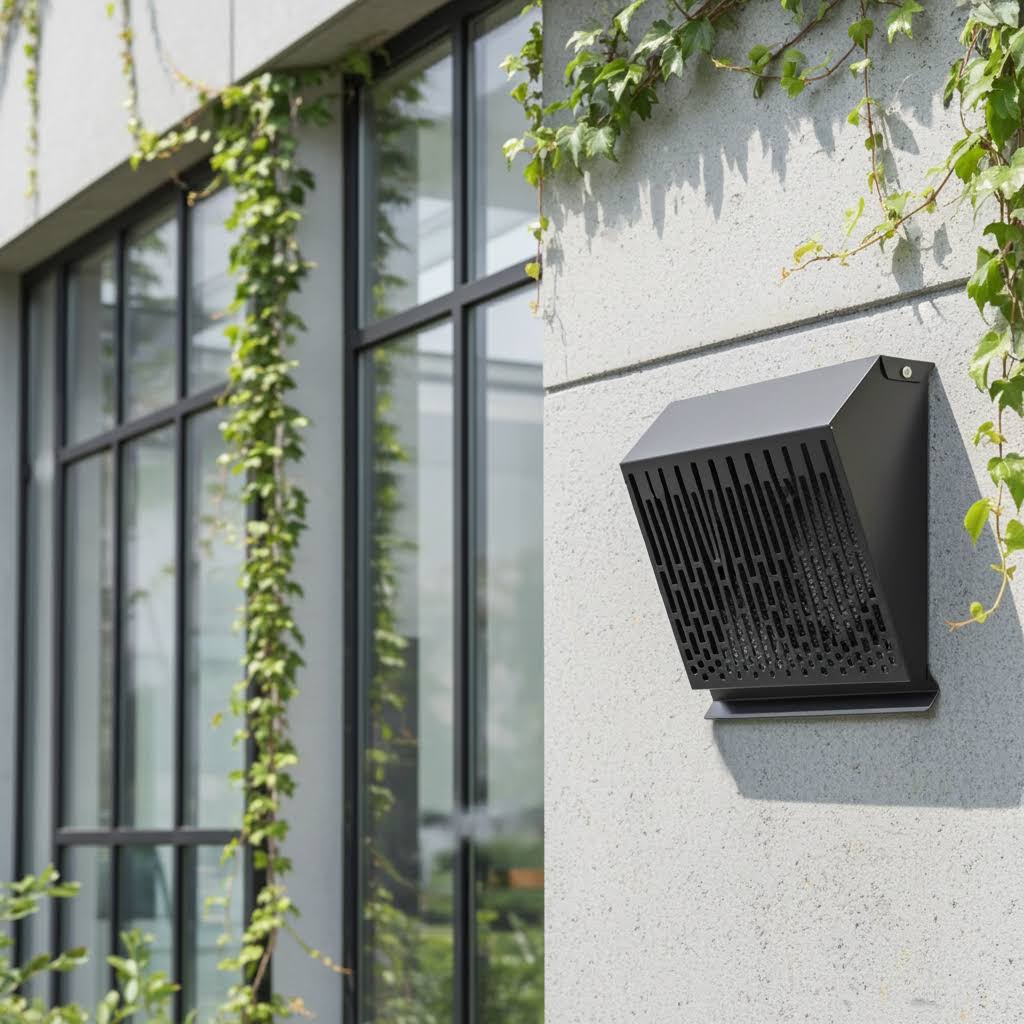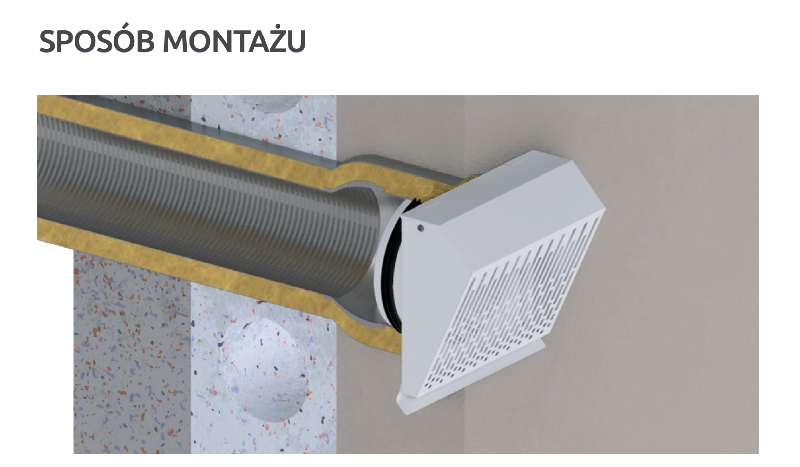 Standardowo wyposażona w okapnik chroniący ścianę przez powstawaniem zacieków oraz siatkę zabezpieczającą otwór wylotowy. Zastosowana geometria prostopadłego do ściany wyrzutu powietrza
